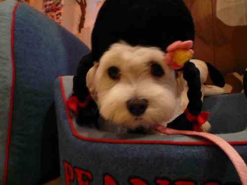 チャッピーは被り物、経験がありませんが毎日散歩の際、巻いている保冷剤入りのハンカチ・バンダナは嫌がりません。気持ち良さそうにしています。