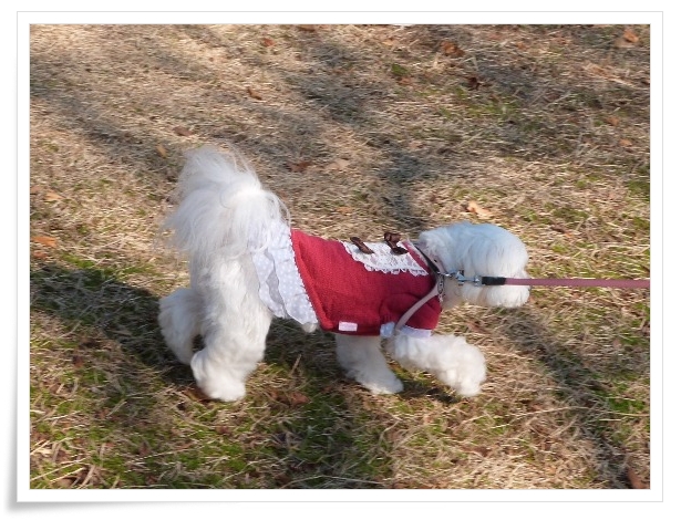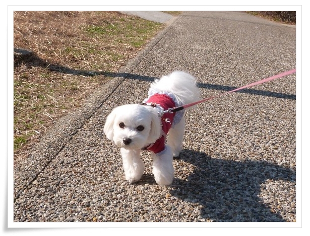 寒くてもお散歩一緒です、まっちろふわふわのべっぴんさんやね♪