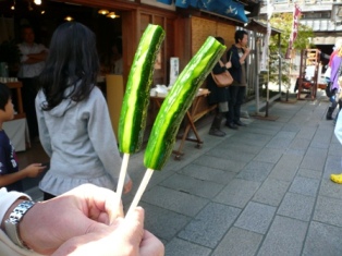 キュウリのお漬物を丸ごとお箸にさしてます