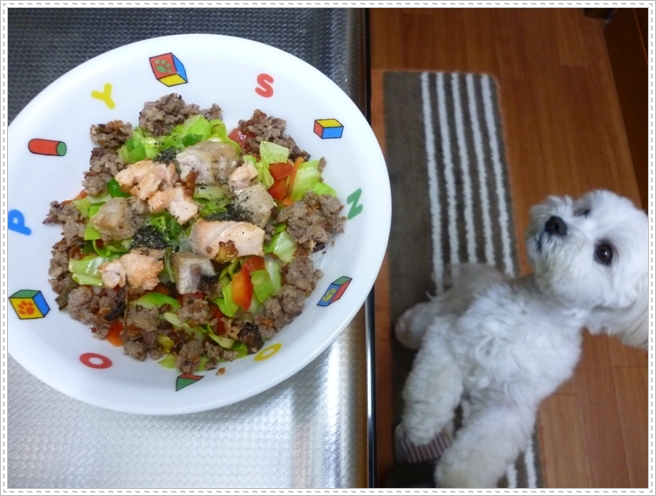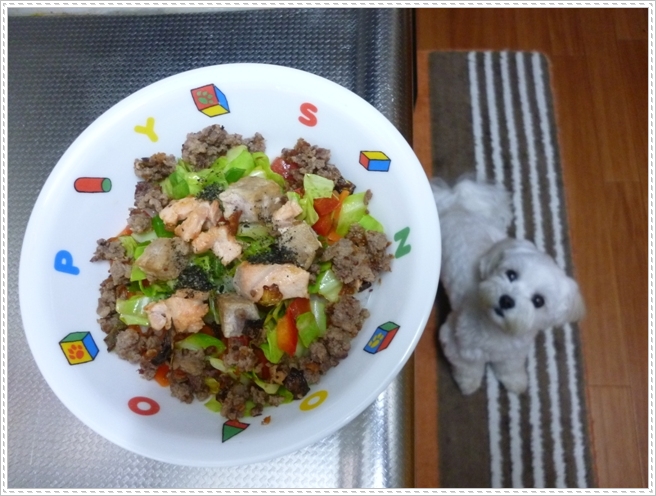 ・馬肉・鶏骨ごとすり身(プライムケイズ)・サーモン ⇐ (ゴマ油で焼いて)