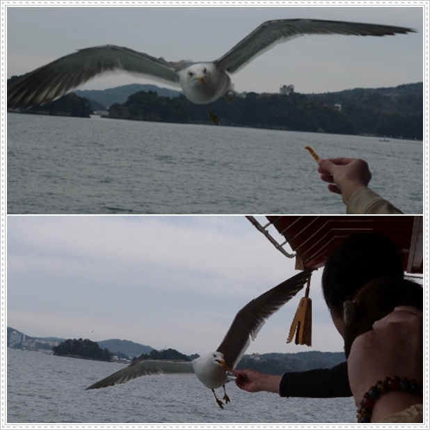 船内放送で「テレビでも紹介されたカモメの餌付けをデッキで」
