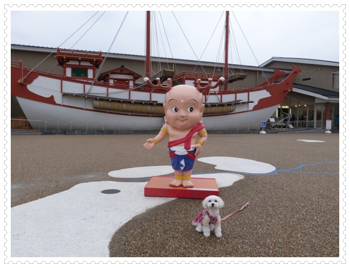 一躍有名になったこの子の人形と遣唐使船の前で