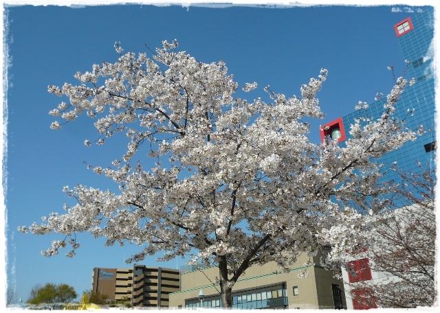 青空に薄いピンクの花びらが素敵です