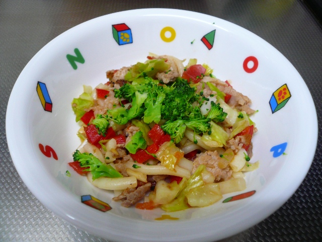 豚肉・きゃべつ・赤パプリカ・もやし・トマト・うどん を炒めて