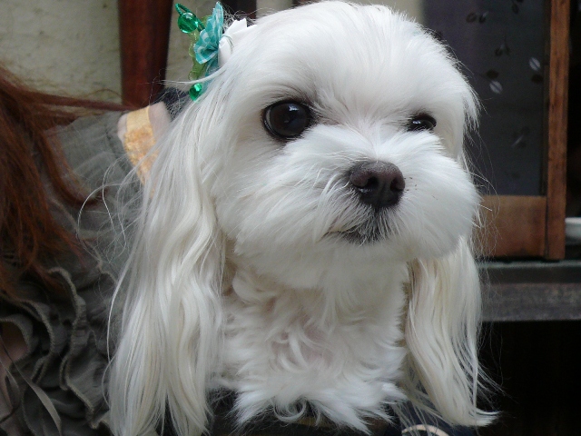 あつこさんのお膝で賢くしているメグくんですよ